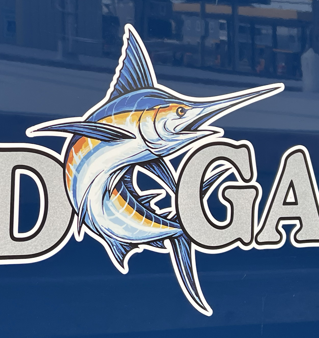 The name is executed in 3M Controltac wrap film, providing a crisp, durable finish suited for marine conditions. A custom illustrated marlin is integrated directly into the lettering, creating a focal point without overwhelming the overall layout. The composition keeps the name highly legible while introducing movement and personality through the illustration.
